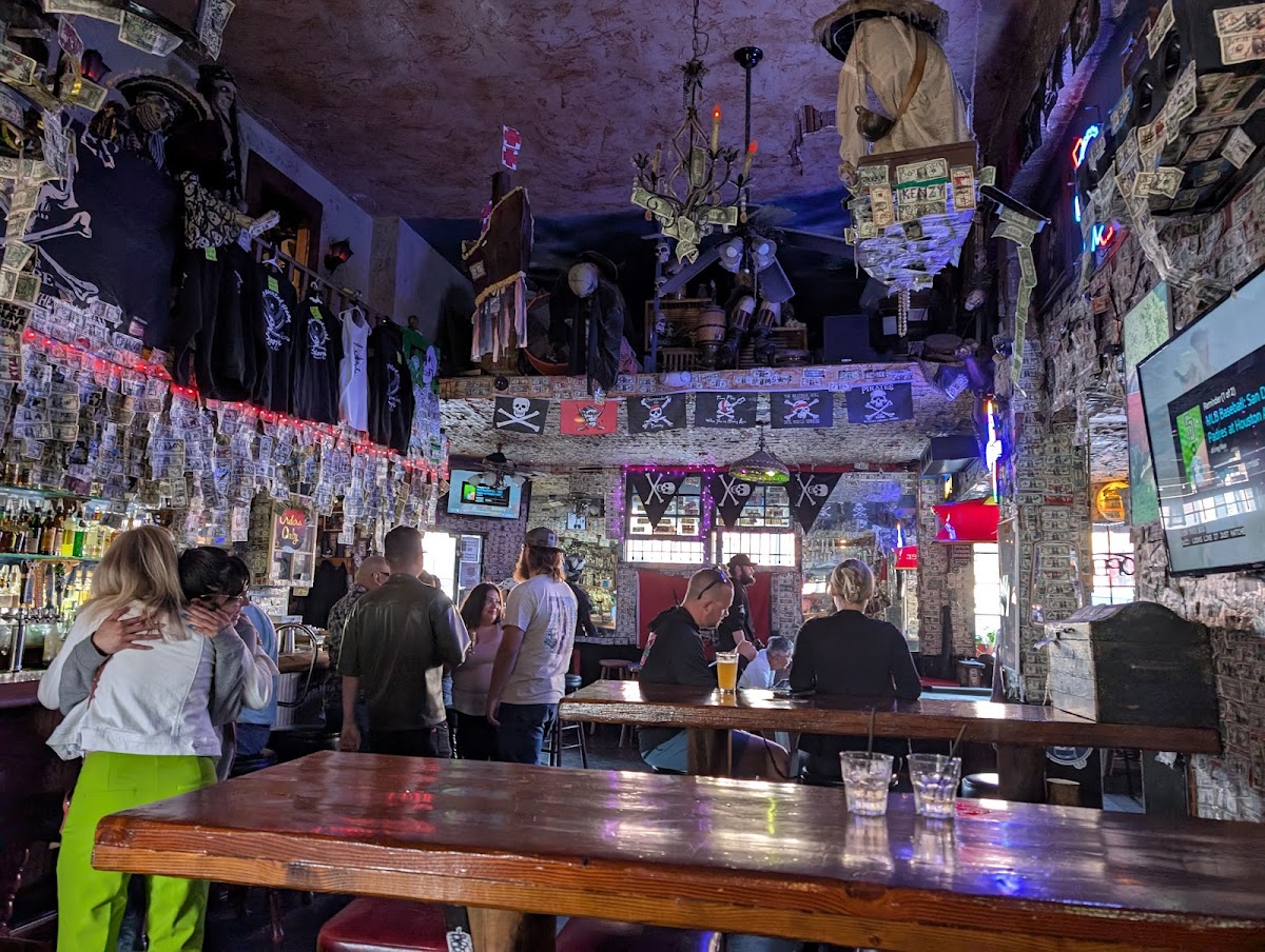 If you're ever in the Downtown Oceanside area and you're hanging out past 9PM at night, there's a good chance that you will find yourself at this local hideaway. Welcome to The Haunted Head Saloon. It's one of Oceanside's most famous Dive Bars. Actually, The Haunted Head Saloon is one of the only bars in Downtown that can be considered "Divey". Because they do not have any food for sale here, you MUST BE 21 OR OLDER to enter. NO EXCEPTIONS. What I love the most about The Head is that their security is on-point and it's relatively safe inside (considering that it's a dive bar). The few times I've seen drama, it was quickly addressed and carried outside. One of the BEST aspects of The Haunted Head is its location. You can find it right off of Mission Ave & Tremont St in the heart of the Downtown Area. It's just north of the Regal Movie Theater. Because of its location, you can walk to the movies, to the pier or beach (2 blocks away) or to any of the parking garages nearby (within 8 minutes). In addition, there is Pier Pizza located right next door to them selling pizza by-the-slice, tacos across the way at Sanchos Tacos, Strawberry Shack for cake desserts & Fugu icecream shop just around the corner. So, you can always find something to eat BEFORE you start drinking AND the pizza shop typically stays opened late for the crowds. The bartenders work quickly (especially considering the crowds) and there is a Full Bar at their disposal. I wouldn't come here for a "foo-foo" pretty cocktail, BUT, simple mixed drinks or shots are best. They've got some TVs in there (just for decoration because everyone's drinking), a pretty solid pool table (that they maintain monthly) and a jukebox that patrons can customize their songs too (download the AMI MUSIC APP). PRO-TIP: There are snack bags by the bar to nibble on, ask the bartender for one There's also a 5 gal water dispenser in the back. The interior is dark, pirate themed and decorated in $1 bills. The tradition is to get yours from the bartender, sign it and tape it up! There's booth seating in the corners, 2 long wooden tables for seating, bar seating & multiple high-chair tables too. The only aspect lacking in this bar are the bathrooms. Well, I can only speak for the men's bathroom. It's small. Cramped and no privacy. Pretty much exactly what I would expect from a dive bar! Anyhow, The Haunted Head Saloon has been around for as long as I can remember and I always recommend passing through late at night when in the Downtown Oceanside area; besides, everything else is closed!